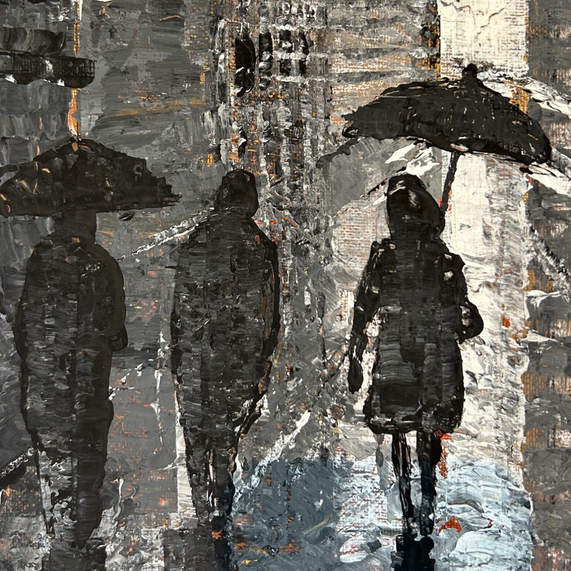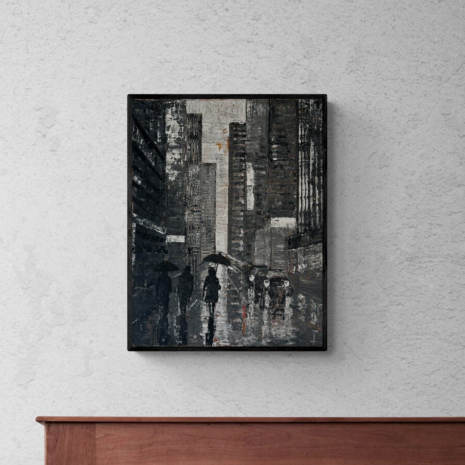 Eine monochrome Farbpalette fängt die Essenz einer regnerischen Straße in der Bronx ein, während Menschen unter ihren Regenschirmen vorbeieilen. Metallische Reflexe auf den Gebäuden lassen die letzten Sonnenstrahlen verblassen.