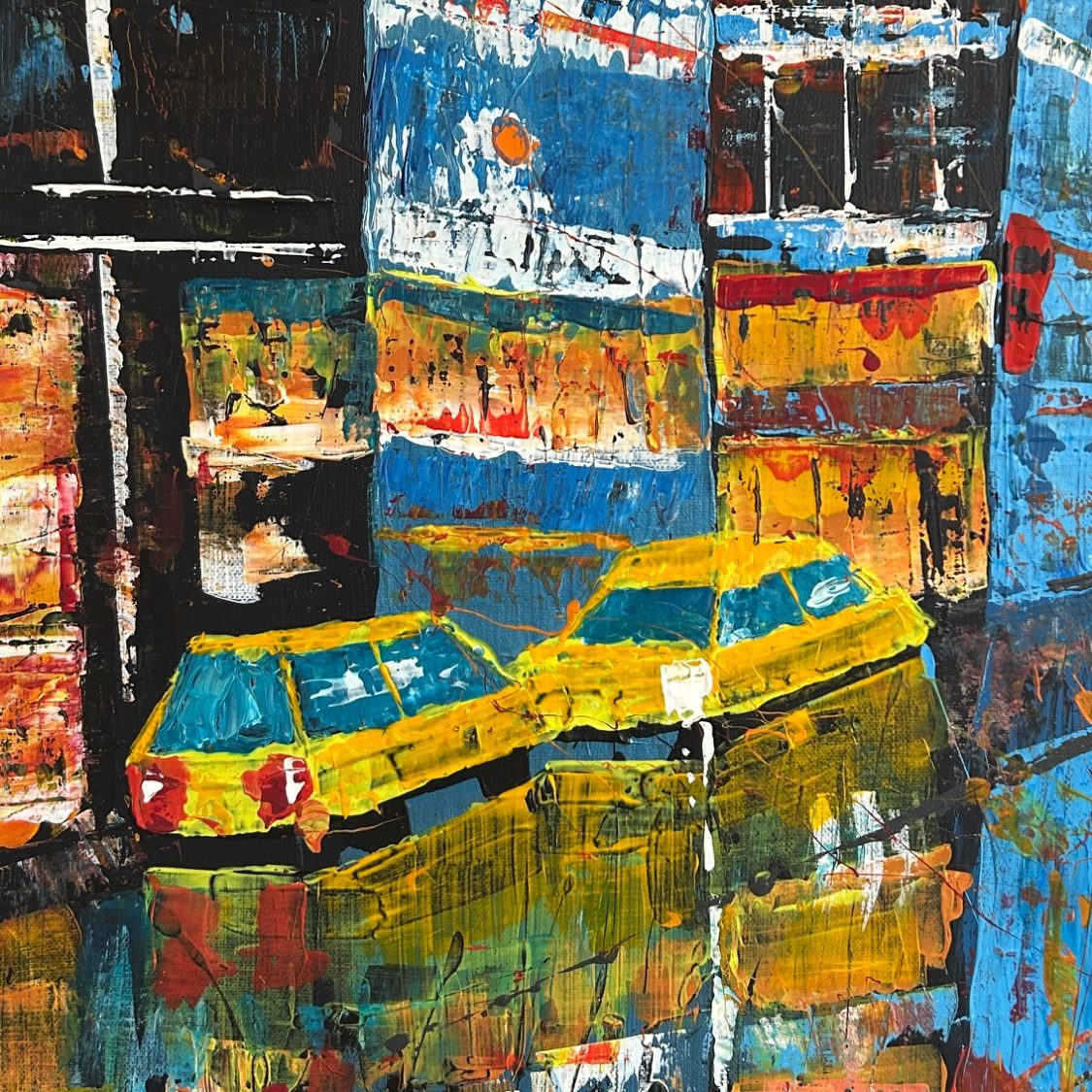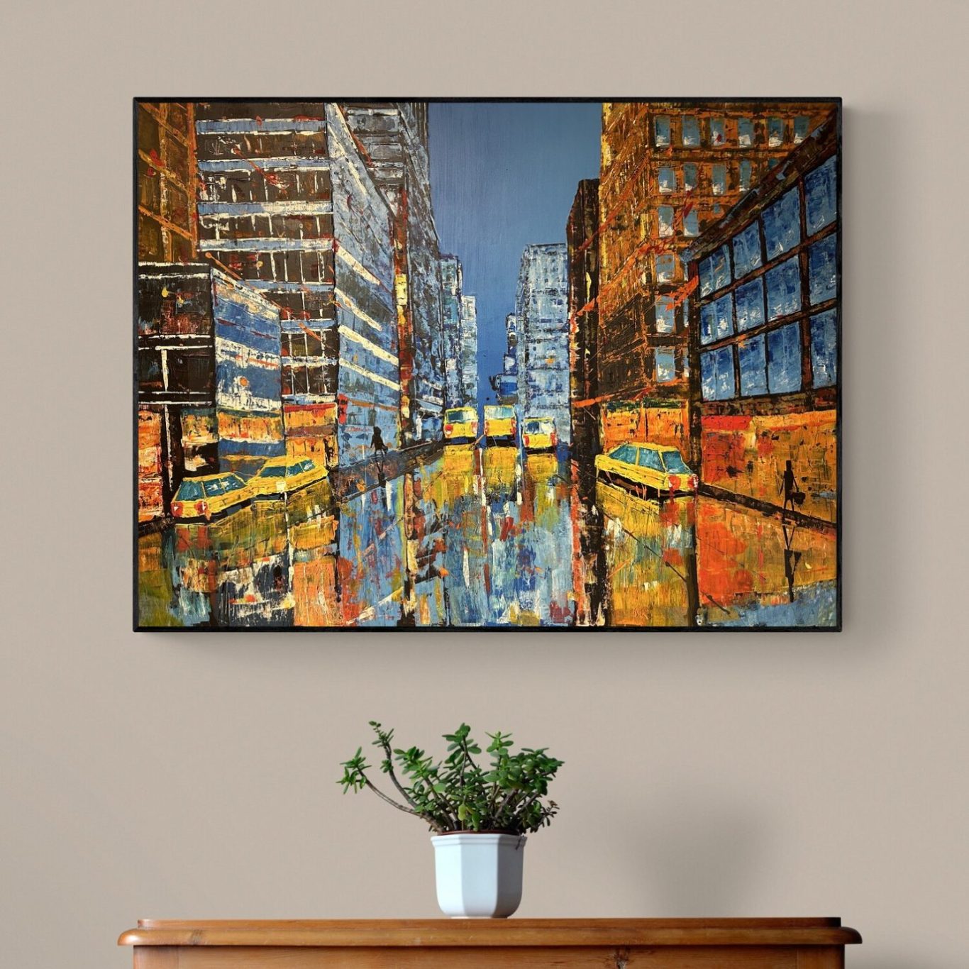 Eine verregnete Straßenschlucht in Manhattan, dominiert von leuchtenden Werbetafeln und Schildern, die sich in der nassen Straße spiegeln.