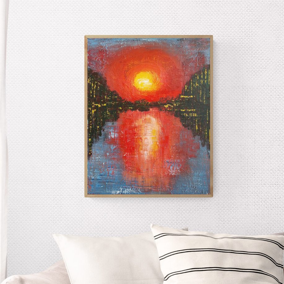 Ein ruhiger Himmel. Bewegtes Wasser. Leuchtende Farben und dicke Texturen fangen einen wunderschönen Sonnenuntergang über einem italienischen See ein.