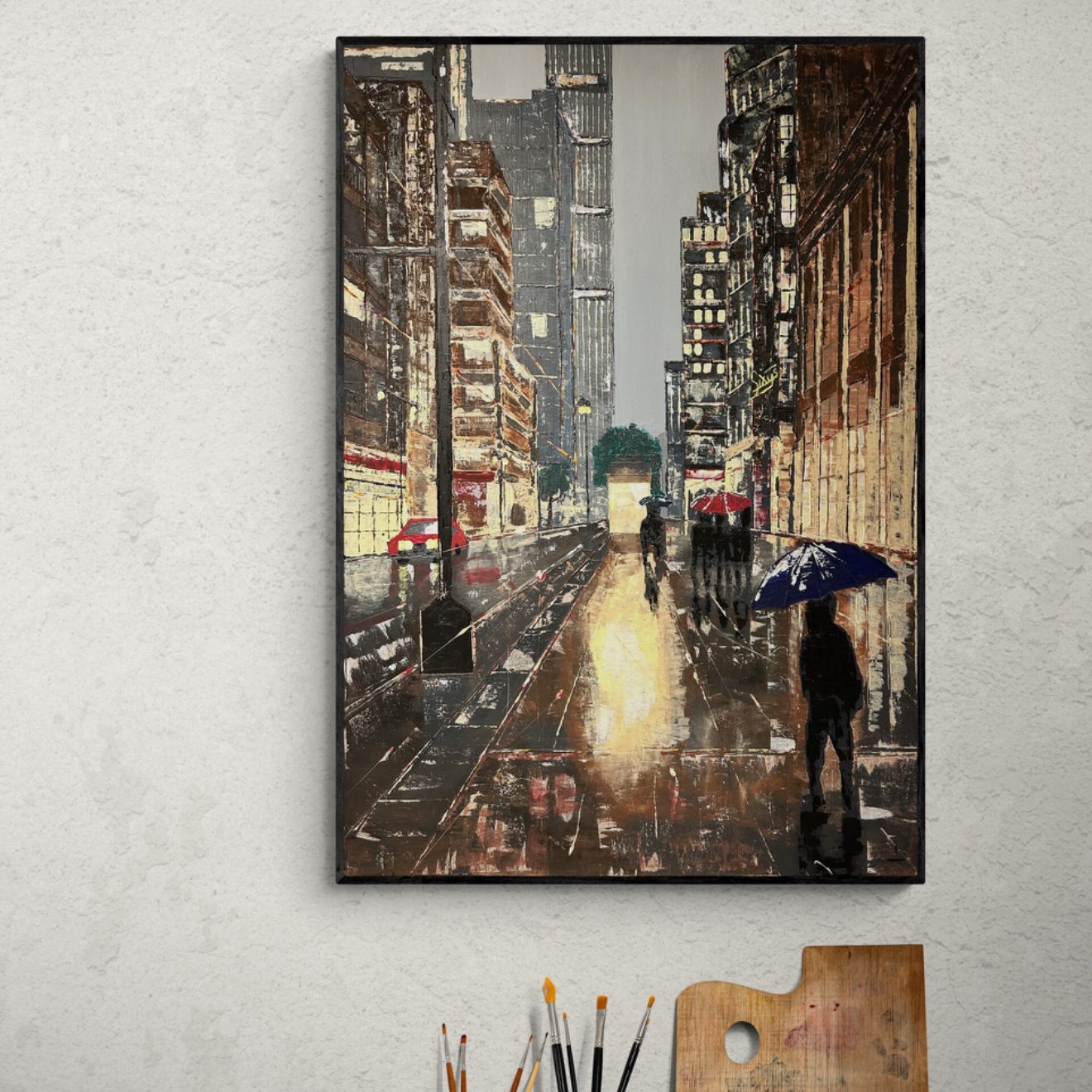 Helle Farben stehen im Kontrast zum verregneten Wetter in einer Einkaufsstraße der französischen Hauptstadt und transportieren den Charme von Paris.